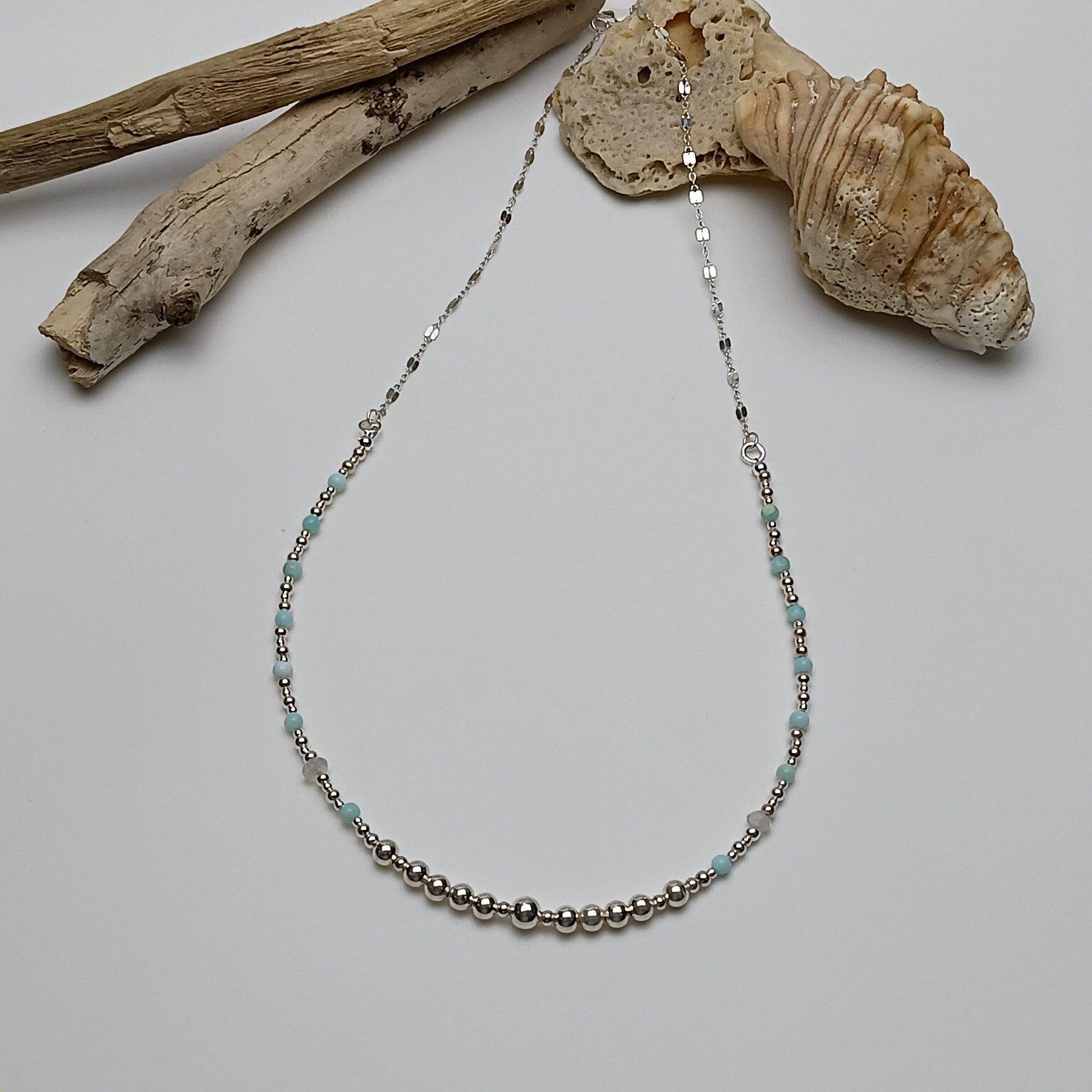 The cool polish of sterling silver beads reflects light beautifully, while the Peruvian Opal introduces gentle washes of pastel blue, seafoam, and milky aqua — tones reminiscent of tranquil coastal waters. Unlike fiery opals, Peruvian Opal is prized for its smooth, calming colour and subtle translucence, giving the necklace a quiet, ethereal elegance.