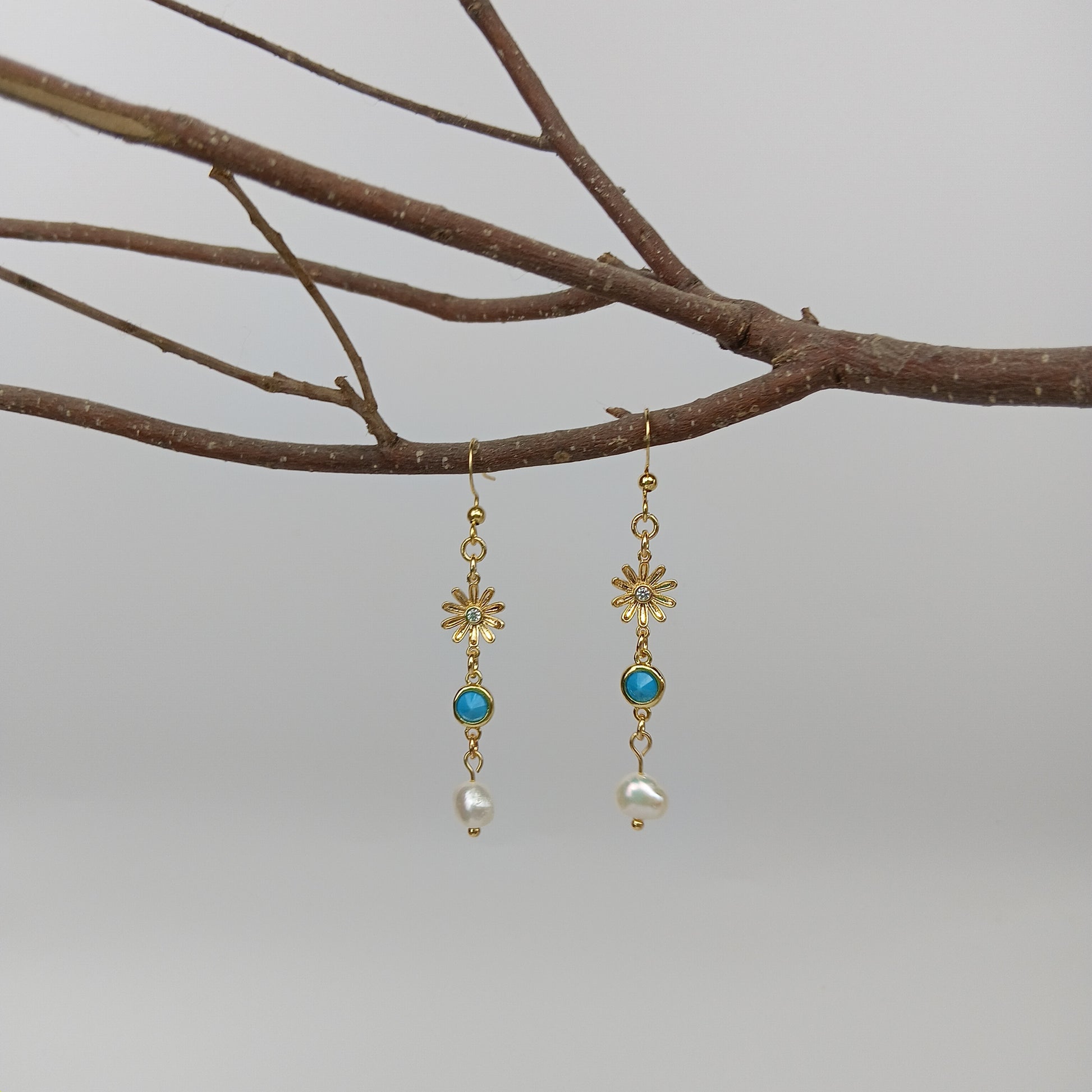 Cute and chic, these dangles sparkle from a zirconia-gold flower, holding a turquoise zirkoon and pearl that sway with every move. Perfect for a playful yet elegant touch.