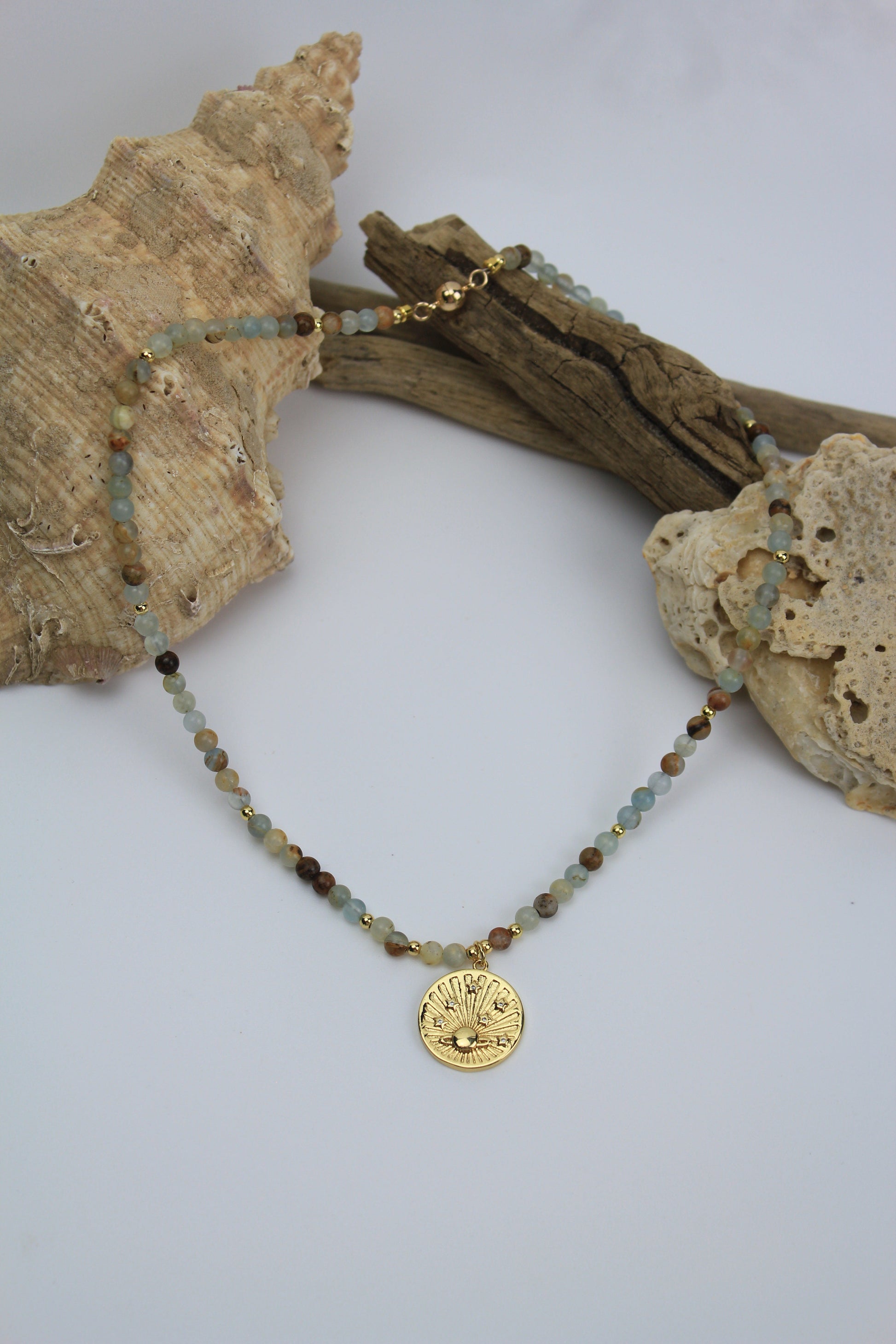 At its center, a gold sunray pendant edged with sparkling clear zirconia radiates warmth, positivity, and light, perfectly complementing the soft ocean-blue tones of the Calcite. Lightweight and luminous, this piece is ideal for women who embrace serenity, refined elegance, and meaningful, statement jewellery, creating a harmonious balance between natural beauty and sparkling sophistication.