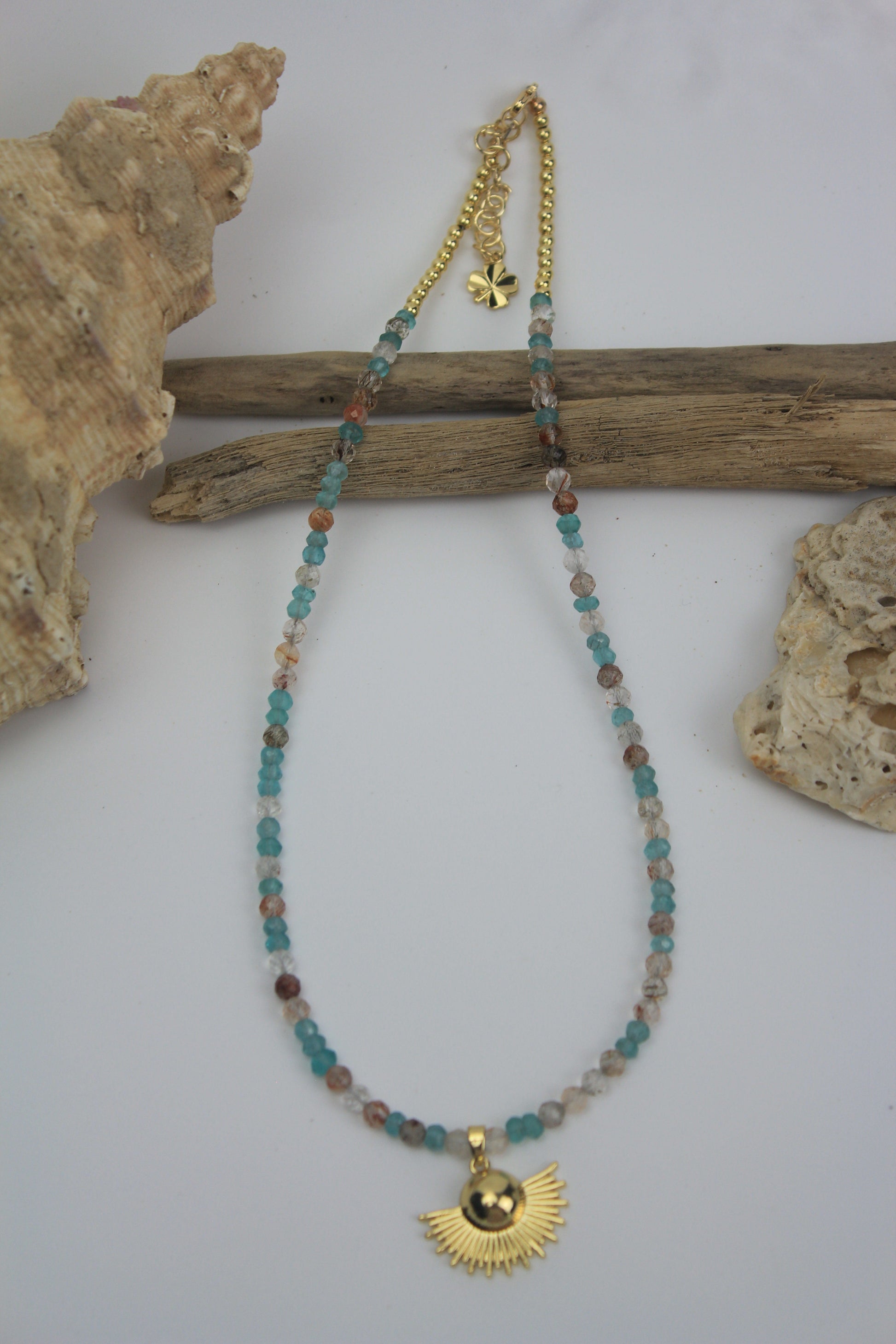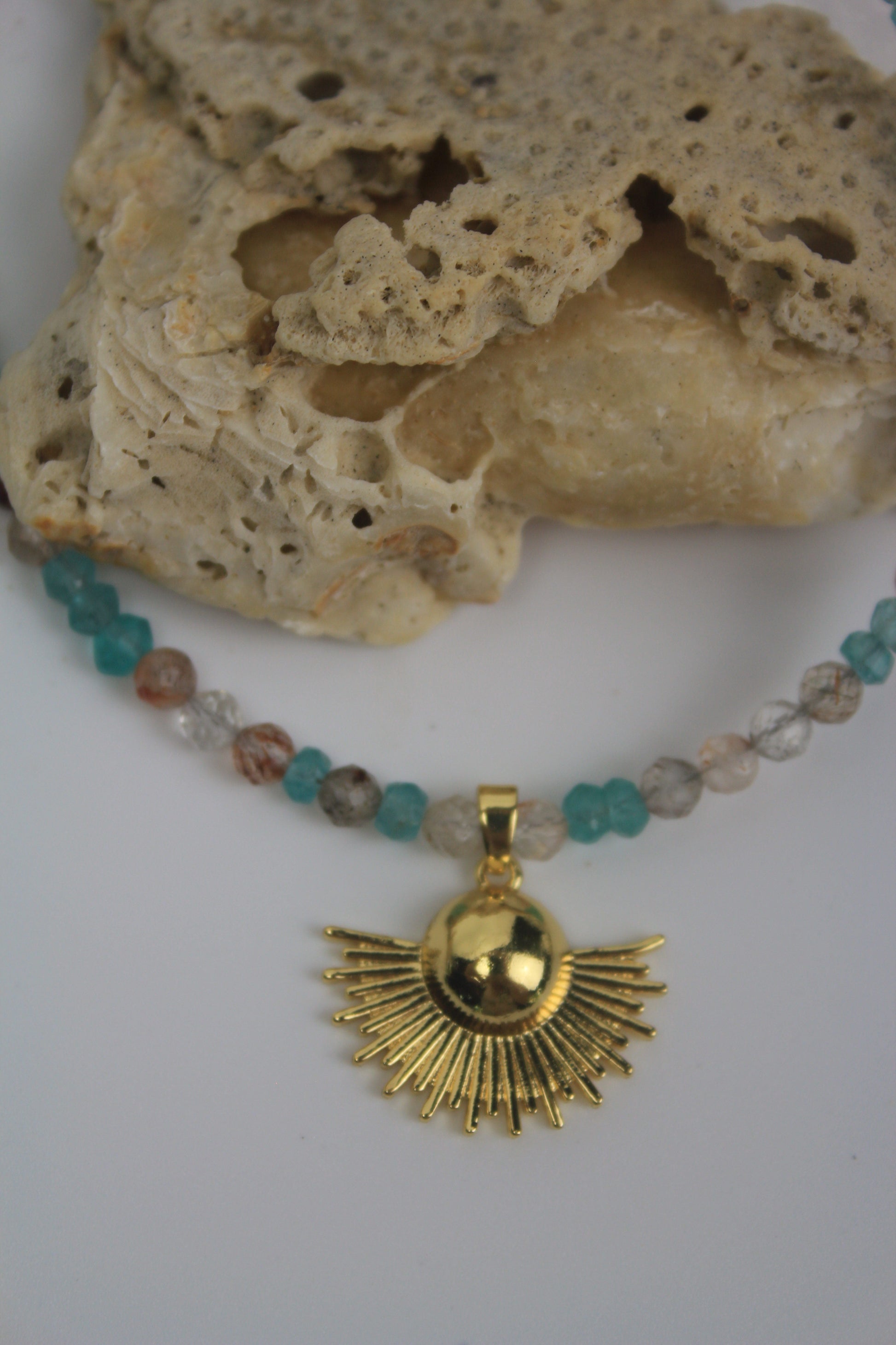 This necklace features seafoam apatite beads with shimmering rutile inclusions, their soft green-blue tones reflecting light like the first morning rays over calm waters. The 18k gold-plated sunray pendant adds warmth and radiance, perfectly balancing the cool serenity of the stones. Together, apatite and rutile create a harmonious blend of clarity, insight, and gentle motivation, inspiring calm confidence and thoughtful intention in every moment.