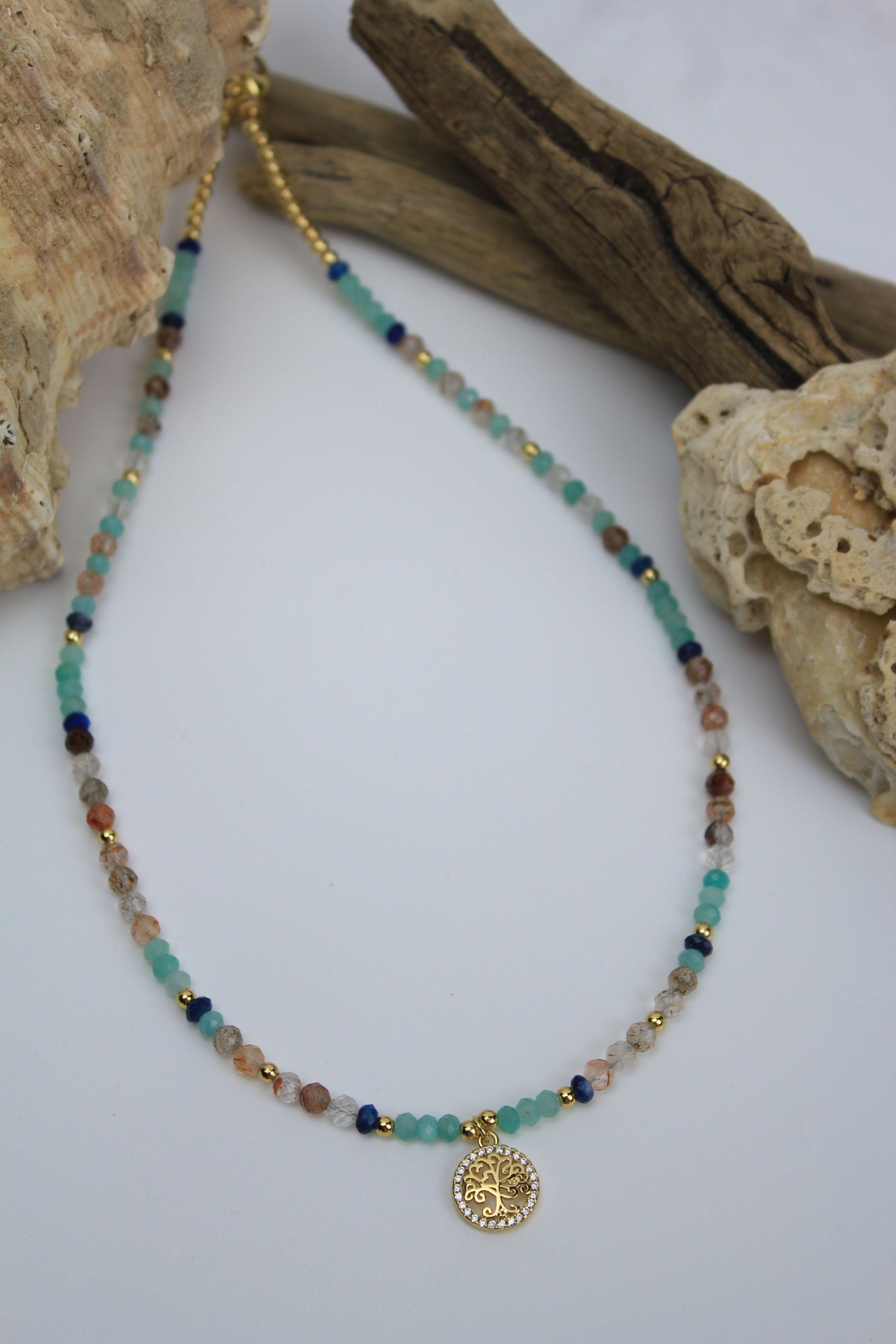 Soft, serene, and radiantly elegant, this necklace features seafoam Apatite beads paired with sparkling Rutilated Quartz accents, creating a delicate palette that evokes calm seas and gentle skies.