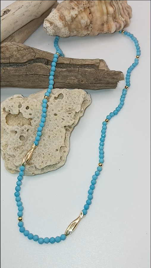Immerse yourself in a little piece of paradise. This delicate necklace features vibrant turquoise faceted beads that shimmer like sunlit ocean water, each one carrying a soft, summery calm. At the center, a graceful 18ct gold-plated fish charm glides effortlessly along the strand, its surface smooth and radiant, accented with a tiny sparkling zirconia that catches the light like a drop of morning dew.